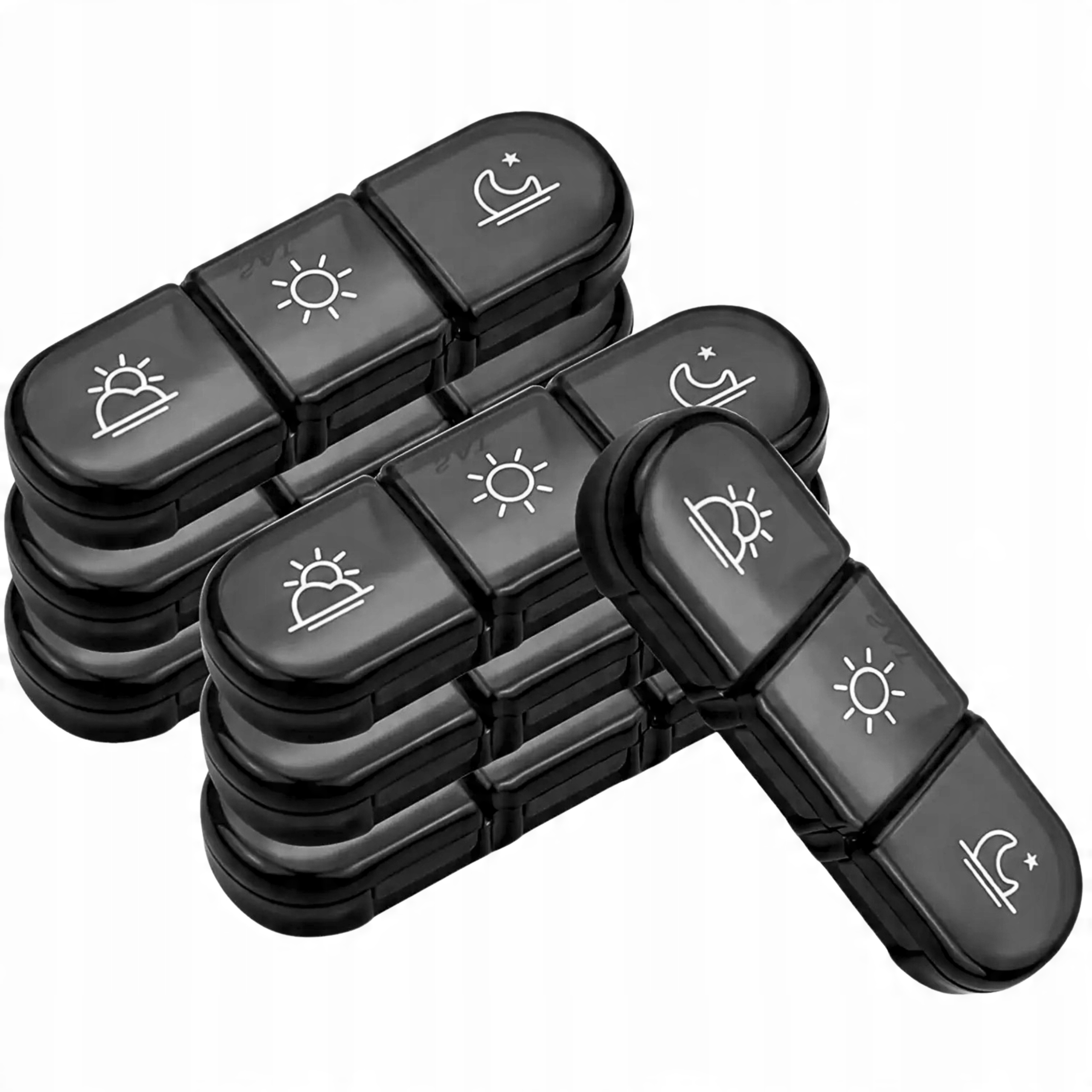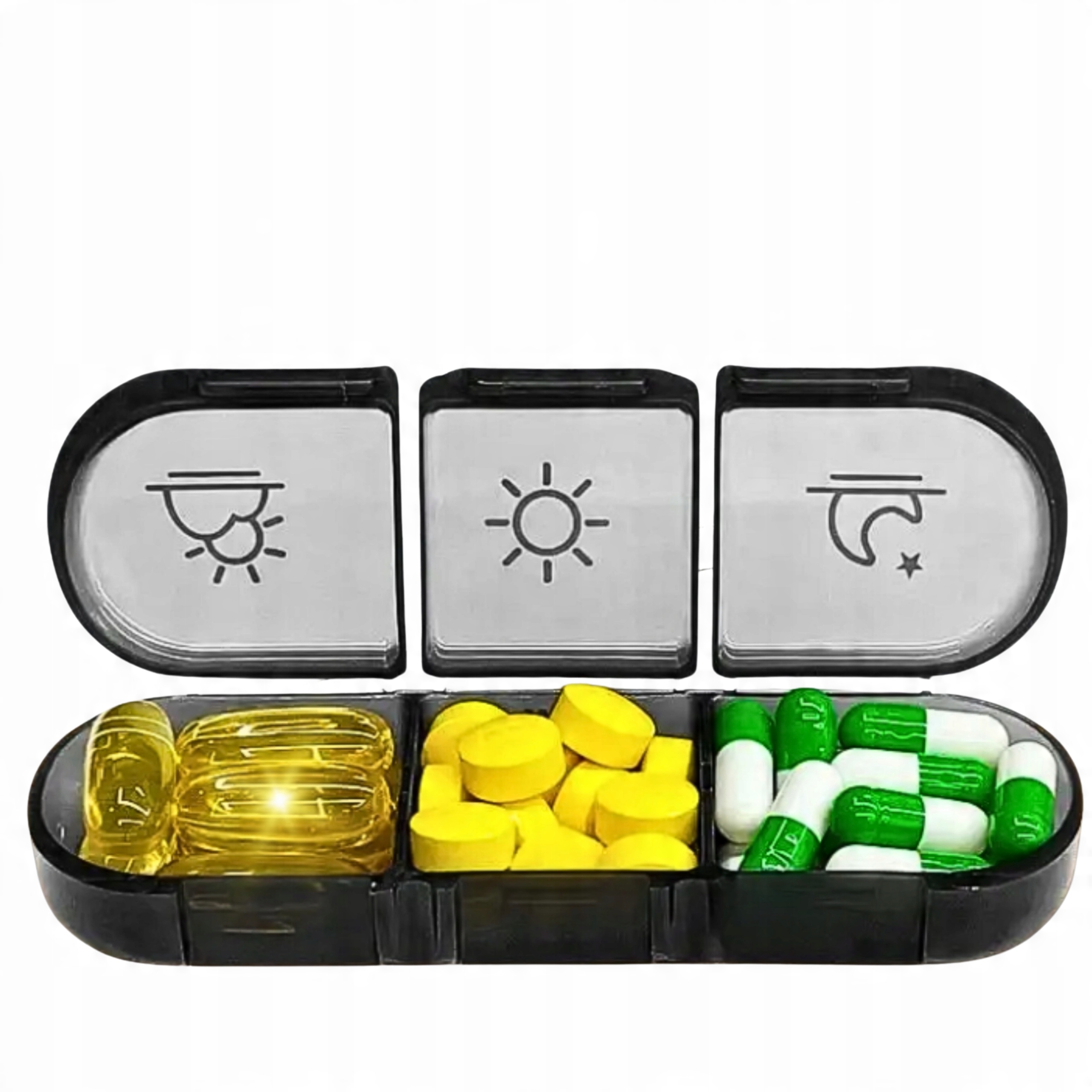 Pojemnik składa się z 7 niezależnych kasetek – każda z nich zawiera 3 przegródki na różne pory dnia. Dzięki temu masz pełną kontrolę nad swoim planem dawkowania.