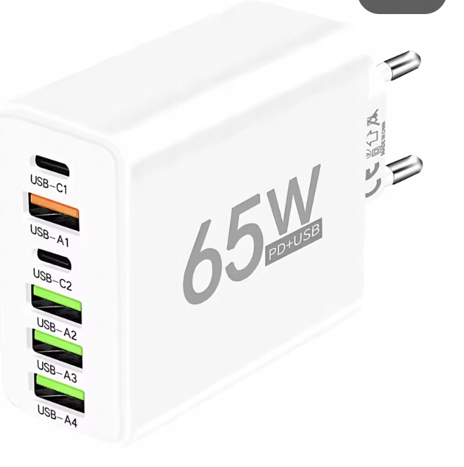 SZYBKA ŁADOWARKA SIECIOWA 6-PORTÓW 2X USB-C, 4xUSB-A 65W